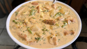 About the recipe– This chowder consists of seasoned chicken breasts, broccoli and potatoes in a creamy, well-seasoned cheese sauce.