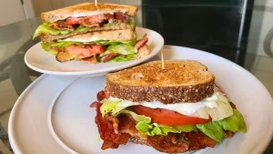 Step 8- Add lettuce onto both slices of bread. Add 2 or 3 strips bacon and 2 tomato slices onto the bottom portion of bread. Take the top slice of bread and place it directly onto of the bottom slice of bread and press down slightly with your hands. From there the sandwiches are ready to be served.