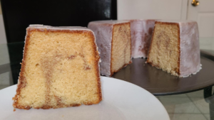 Step 6- Pour your prepared cake batter into your tube pan. Spread the batter around your tube pan as evenly as possible with a spatula. Generously sprinkle cinnamon on top of the cake batter. Swirl the cinnamon down into the cake batter using a small spoon going around the tube pan 2 times. Spread the cake batter around the tube pan as evenly as possible. Shake the tube pan and tap the bottom of the tube pan with your hand to make the batter even.
