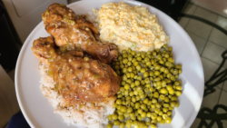 Smothered chicken is a comfort meal that consists of chicken smothered in a well-seasoned chicken gravy and served over rice. This dish also goes with sides with green peas, green beans and potato salad.